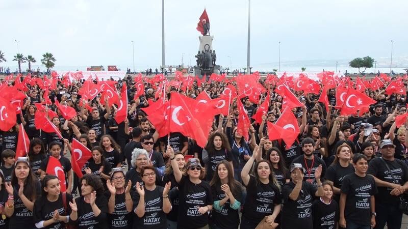 İmzanın oluşturulması için saatler 15.00’i gösterdiğinde ise, ara sıra ise şiddetini arttıran yağmura rağmen kalabalık dağılmadı. Hep bir ağızdan ellerinde Türk Bayraklarıyla İzmir Marşı’nı ve onuncu yıl marşını coşkuyla söylediler.