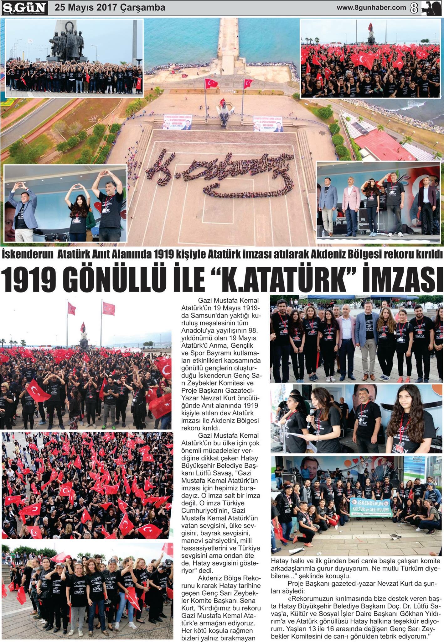 Gazi Mustafa Kemal Atatürk’ün 19 Mayıs 1919’da Samsun’dan yaktığı kurtuluş meşalesinin tüm Anadolu’ya yayılışının 98. yıldönümü olan 19 Mayıs Atatürk’ü Anma, Gençlik ve Spor Bayramı kutlamaları etkinlikleri kapsamında gönüllü gençlerin oluşturduğu İskenderun Genç Sarı Zeybekler Komitesi öncülüğünde Anıt alanında 1919 kişiyle atılan dev Atatürk imzası ile Akdeniz Bölgesi rekoru kırıldı.